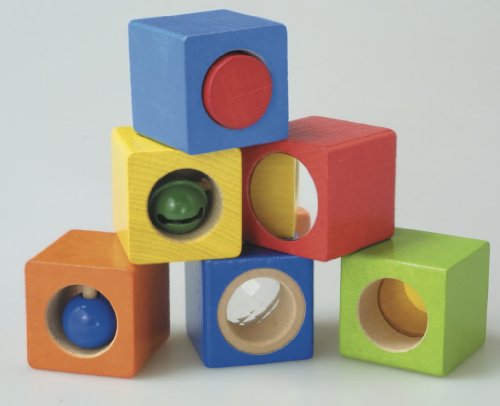 A set of 6 different colored cubes each with its own secret to discover that will arouse the curiosity of any child. The cubes include a rattle, push button, mirror, rotating ball, colored plexiglass and kaleidoscope.